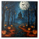 This Halloween design plunges you into a haunted forest, lit by an imposing full moon. A winding paved path, surrounded by bare and tortuous trees, leads to a mysterious haunted house perched on a distant hill. Sculpted pumpkins with worrying smiles line the path, throwing an orange glow on fallen autumn leaves. Bats swirl around in the sky bathed in lunar light, accentuating the scary atmosphere. Ideal for Halloween's decoration, this design captures the essence of an enchanting autumn night, mixing mystery and fun thrills.