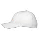 Fits well due to elastic edging, not adjustable. Good qualty material. Good quality embroidering. Subtle lettering (white on beige) just as my wife likes.