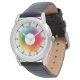 Modern and sleek vintage inspired colour wheel watch. This quality timepiece is embellished with a lovely colour wheel pattern from a nineteenth century vintage art illustration. "The Prismatic" is available in a large selection of style and strap options . "The Prismatic" wristwatch contrasts the sleek modern styling of today's fashion timepiece with very, very old school art illustration. A bold and uniquely artistic fashion statement. Govern yourselves accordingly...