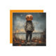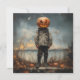 The image depicts a figure standing in an outdoor setting, wearing a worn-out, rugged military-style outfit with boots. Instead of a head, the figure has a large carved pumpkin with a menacing, glowing jack-o'-lantern face. The sky is overcast, giving the scene an eerie atmosphere, and the ground is scattered with dry vegetation and two small pumpkins, emphasizing the Halloween theme. The painting style is reminiscent of classic Americana, evoking a sense of both nostalgia and unease.