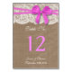 The rustic pink bow wedding collection is a stunning design featuring a lovely rustic burlap effect background with a romantic vintage white lace effect trim and a stunning pink bow. These table number cards can be personalized for your special occasion and would make the perfect table centerpiece for your wedding, bridal shower, engagement party, birthday party and much, much more.
