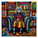 A.I .created print of a child with a solemn expression and sad eyes sits on a striped armchair, wearing a vibrant multicoloured outfit that matches the geometric patterns in the background.