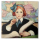 Jessie Willcox Smith was an American artist known for her idyllic imagery of childhood. She was the cover illustrator for the magazine Good Housekeeping for 15 years.A young girl with red hair tied in a blue bow sits at a desk with a large open book, thoughtfully holding a pencil to her mouth. A detailed map of Europe hangs on the wall behind her, indicating a classroom setting.This painting is called “The Scholar”.