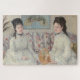 This design features a painting by the French Impressionist artist Berthe Morisot (1841–1895). It depicts two elegant sisters seated together on a sofa. Both of the sisters look alike: they have similar brunette hairstyles and they are both wearing dresses that are white with blue dots. They are wearing black choker-style necklaces. The ladies are in an elegant sitting room. The sister on the right is holding a fan in her hand. The original artwork was painted by Berthe Morisot in 1869.