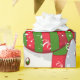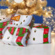This image is of a snowman family, all dressed in their coloured winter hats and scarves. A carrot for their nose and coloured buttons for their eyes and mouth. A green and red backround with snow confetti has been added. This wrapping paper is available in assorted styles and sizes.