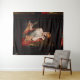 This is a beautiful portrait of a young 1920s woman dressed in the retiring attire of the day, which includes a flapper cap, sheer night gown, and embroidered dressing robe looking into a hand mirror while adjusting her cap over her left ear while leaning on a trunk.