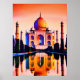 Poster in an illustration of the Taj Mahal, reflected in the water, and backed by a deep coral orange sunset sky