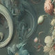 In The Theatrics of Thirst, florals erupt with decadent drama—teal peonies, blushing roses, and spindled coral blooms spiral around a grotesque, thirsting fountain-head, mouth agape in a silent soliloquy. Every petal performs, every vine craves applause.