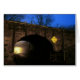 The tunnel is made of bricks with a yellow sign on it. The blue sky is breathtaking and piercing as it peeks over the tunnel. At dusk the street beyond the arch has reflections of light that create a sense of mystery and magic. At dawn the scrubs, poles and trees all add to the atmosphere.