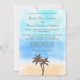 The design features tropical palm trees on a beautiful watercolor background of soft sand, cool blue sea and a stunning turquoise sky. Perfect for any beach celebration!
