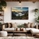 Majestic mountains rise beneath a golden and blue sky, wrapped in serene mist. A delicate geometric web overlays the scene, transforming it into a surreal dream where raw nature meets soft art. Vibrant colours, lush vegetation, and the contrast between realism and abstraction create a work that inspires peace and wonder—perfect for those seeking to connect with the magic of the natural world.