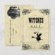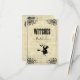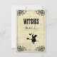 Vintage images of a witch on a broomstick with a bat, and spider webs have been laid over an aged background that features the hand written testimony from the Salem Witch trials, © Wickedly Lovely