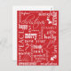 The words of Christmas in various typefaces make a collage on this postcard. Christmas icons are dispersed in between the words. Add your own holiday message on the back. Available in alternate colours with matching products.