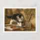 A fine art postcard with the painting from the Romanticism movement, The Young Artist by the Dutch artist Henriëtte Ronner-Knip (1821-1909). A black and white tiger kitten playing with art supplies on a table.