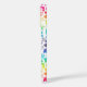 iPhone case with cheery rainbow coloured pattern of theatre-related icons on white background, with aqua coloured drama masks in a circle where you can add a name, date, initials, etc. to personalize this case for your favourite theatre-lover. Some of the icons include: Shakespeare, drama masks, microphone, music notes, director's chair, tickets, stars, stage curtains, spotlight, roses, and more.