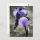 A photograph of a new purple Iris flower blossom. The background is a boulder in the garden.