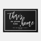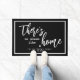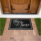 This doormat features white text that reads: "There's no place like home" along with a small heart and your custom name, established date or other text.