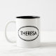 Check out this Theresa mug! Is your name Theresa? Or do you have a wife, girlfriend, female family member or female friend named Theresa? If so, this "Name Stamp" mug is exactly the gift that you're looking for! The design features "Theresa" in big black lettering surrounded by two ovals, one thin and one thick.