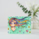 A post card featuring a coloured pencil traditional illustration of a girl with large purple eyes floating on a teal green background. Her lovely long hair flows to the right and is made up of blue, pink, purple and yellow strands making it seem like a rainbow. Around her there are stars and hearts scattered.