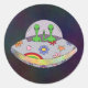 In this fun sci-fi illustration by Richard H. Fay, groovy green aliens ride in a flying saucer decorated with flowers, hearts, a star, and a rainbow.