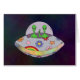 In this fun sci-fi illustration by Richard H. Fay, groovy green aliens ride in a flying saucer decorated with flowers, hearts, a star, and a rainbow.