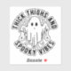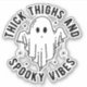 This fun and spooky Halloween design features the phrase "Thick Thighs and Spooky Vibes" arranged in a circular layout around a cute, classic ghost illustration. The ghost, with its simple yet expressive eyes, is the central focus of the design, giving it a playful and whimsical vibe. Hanging from the ghost's hands are two small spiders, adding a touch of creepiness to the otherwise light-hearted design. The text is bold and clean, creating a strong visual impact while maintaining a playful tone. The black and white colour scheme gives the design a timeless and versatile look, making it perfect for Halloween.