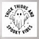 This fun and spooky Halloween design features the phrase "Thick Thighs and Spooky Vibes" arranged in a circular layout around a cute, classic ghost illustration. The ghost, with its simple yet expressive eyes, is the central focus of the design, giving it a playful and whimsical vibe. Hanging from the ghost's hands are two small spiders, adding a touch of creepiness to the otherwise light-hearted design. The text is bold and clean, creating a strong visual impact while maintaining a playful tone. The black and white colour scheme gives the design a timeless and versatile look, making it perfect for Halloween.