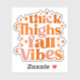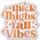 This vibrant and playful fall design features the fun and confident phrase "Thick Thighs Fall Vibes" in a bold, retro-inspired font. The text is arranged in a dynamic, stacked layout, with each word filled in warm autumn hues, including shades of orange, peach, and soft pink. The surrounding star-like sparkles add a touch of whimsy and shine, enhancing the festive and cozy feel of the design. The typography is both bold and curvaceous, giving it a lively, vintage appeal that perfectly captures the essence of fall.