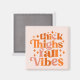 This vibrant and playful fall design features the fun and confident phrase "Thick Thighs Fall Vibes" in a bold, retro-inspired font. The text is arranged in a dynamic, stacked layout, with each word filled in warm autumn hues, including shades of orange, peach, and soft pink. The surrounding star-like sparkles add a touch of whimsy and shine, enhancing the festive and cozy feel of the design. The typography is both bold and curvaceous, giving it a lively, vintage appeal that perfectly captures the essence of fall.
