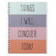 Organize your thoughts! This fun and stylish notebook features a background of colourful stripes. The colour palette consists of blue, purple, and different shades of pink. The notebook reads, “THINGS I WILL CONQUER TODAY” in black ink. This phrase can be a daily motivational reminder! The dimensions of this notebook are 6.5 x 8.75 inches, and it contains 80 black and white lined pages. These are terrific gifts for teachers! As a former teacher, I know there are a countless amount of tasks to do on a daily basis. It was always nice to have some sort of notebook or notepad to keep all the important items organized. These also make wonderful gifts for college students, teens, secretaries, etc. Zazzle notebooks are excellent quality, and I know you will be satisfied with your purchase. Please message me via Zazzle if you have any questions or concerns regarding the design of this product.