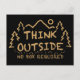 This design says "Think Outside, No Box Required" with a mountain range and trees in the background. A fun design for the outdoor lover!