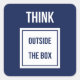 A sticker with a fun motivational caption, for getting ahead in business. 'Think' in white, outside the box, which contains the words 'outside the box' in deep pink.