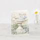 Thinking of You greeting card featuring a watercolor illustration of a birdbath surrounded by a garden of blue and pink flowers and foliage growing around the base of the birdbath. The foliage is depicted in various shades of green. A neutral beige watercolor background and muted and pastel colours, contribute to a serene and gentle aesthetic. The phrase "Thinking of You" in a flowing, handwritten-style script at the top right of the image. A serene illustration complemented by a warm and sentimental message. The neutral watercolor background is repeated on the inside left. The custom greeting "Sending happy thoughts your way today" displays on inside right and birdbath illustration repeated in lower left with space between greeting and illustration to write a personal note.