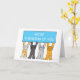 Four different cartoon cats holding up a large blue sign above their heads that says 'Thinking of you'.