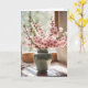 Pink cherry blossom bouquet in a vintage vase in sunlight and rustic farmhouse window background.