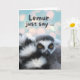 Cute Thinking of You, paper greeting card with a photo of a ring tailed lemur wrapped up in its tail. Wildlife themed greeting card. Lemur just say ... or Let me just say... pun written on the cover. Customize the interior message as desired. Art, image, and verse copyright © Shoaff Ballanger Studios, 2024.