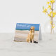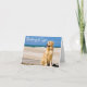This fun canine note card features an image of a beautiful yellow Golden Retriever puppy dog sitting on a wooden boardwalk alongside the ocean with a "Thinking of you" greeting printed in a cursive white font highlighted against vibrant blue sky/