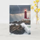 Glowing lighthouse on ocean rocks in a storm with lightning and wild waves.