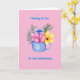 Watercolor arrangement of flowers set in a blue coffee mug set in a pink background. Inside of card reads "Let the adventure continue"!