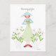 A young girl holding a bouquet of daisies, while standing in a field of daisies. She is wearing a pale blue and lime green dress and wearing a pale blue and lime green hat and her shoes are apple red with a white daisey.