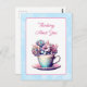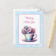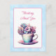 Let a friend know you are thinking about them or miss them with this pretty card. Vintage antique teacup full of purple, pink and blue flowers. AI art generative content.