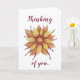 "Thinking of you" greeting card with a golden yellow sunflower and scripted message surrounding the illustration. Perfect for dropping a hello to a friend or sending a note of sympathy. Blank on the inside.