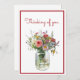 A watercolor illustration of pretty pink, red, and blue flowers in a jar. This botanical illustration art is perfect for a simple Thinking of You greeting, but you can change the text to your preferred greeting. AI assisted graphic purchased with commercial use. Artwork: DreamCafeArt