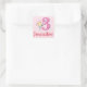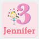 Big pink and purple number three. A cute cartoon girl with yellow hair and a blue dress. Above her head are love hearts and butterflies. Below is a text template to add a name.
