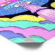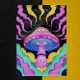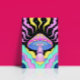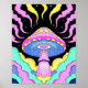 This vibrant image depicts a highly stylized and psychedelic mushroom as its central focus. The mushroom has a bright pink cap with yellow spots and a prominent "third eye" design in the centre of its blue underside. Swirling, colourful clouds in shades of pink, yellow, and turquoise surround the mushroom, set against a dark background speckled with small, glowing stars. The overall aesthetic is whimsical, mystical, and deeply reminiscent of psychedelic art.