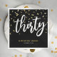 Modern 30th birthday party napkins featuring a stylish black background, gold confetti, the title 'thirty' in a bold white script font, the saying 'happy birthday', their name, and the date of the celebration.