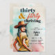 A fun 30th birthday party invitation template for women with a Western theme, featuring a sketch with watercolor accents of a beautiful woman wearing a cowgirl hat, in a flirty pose, with the title "thirty and flirty and thriving". A fun 30th birthday invite for a woman on her thirtieth birthday.