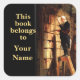 These customizable bookplate square stickers have a man on a ladder in an old library, looking at books.
