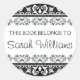 Elegant, stylish, black and white book labels with vintage lace damask border top and bottom. Text: "this book belongs to [customizable name]"