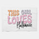 This playful and colourful design features the phrase "This Girl Loves Halloween" in bold, retro-style lettering. The text is divided into three lines, with each line having a distinct colour palette. The word "THIS" is in a soft, textured orange, "GIRL" in a pastel purple, and "LOVES" in a light, bubblegum pink. The word "Halloween" is scripted in a smooth, black cursive, adding contrast and balance to the design. Each letter has a slightly rounded, bubbly shape, giving the design a fun and whimsical feel, perfect for celebrating the festive and lighthearted spirit of Halloween.